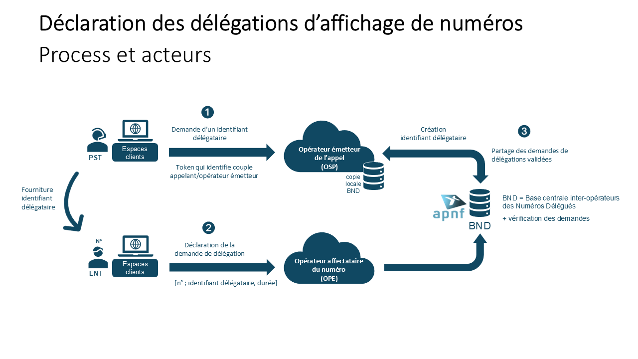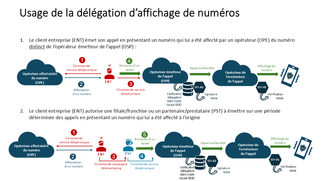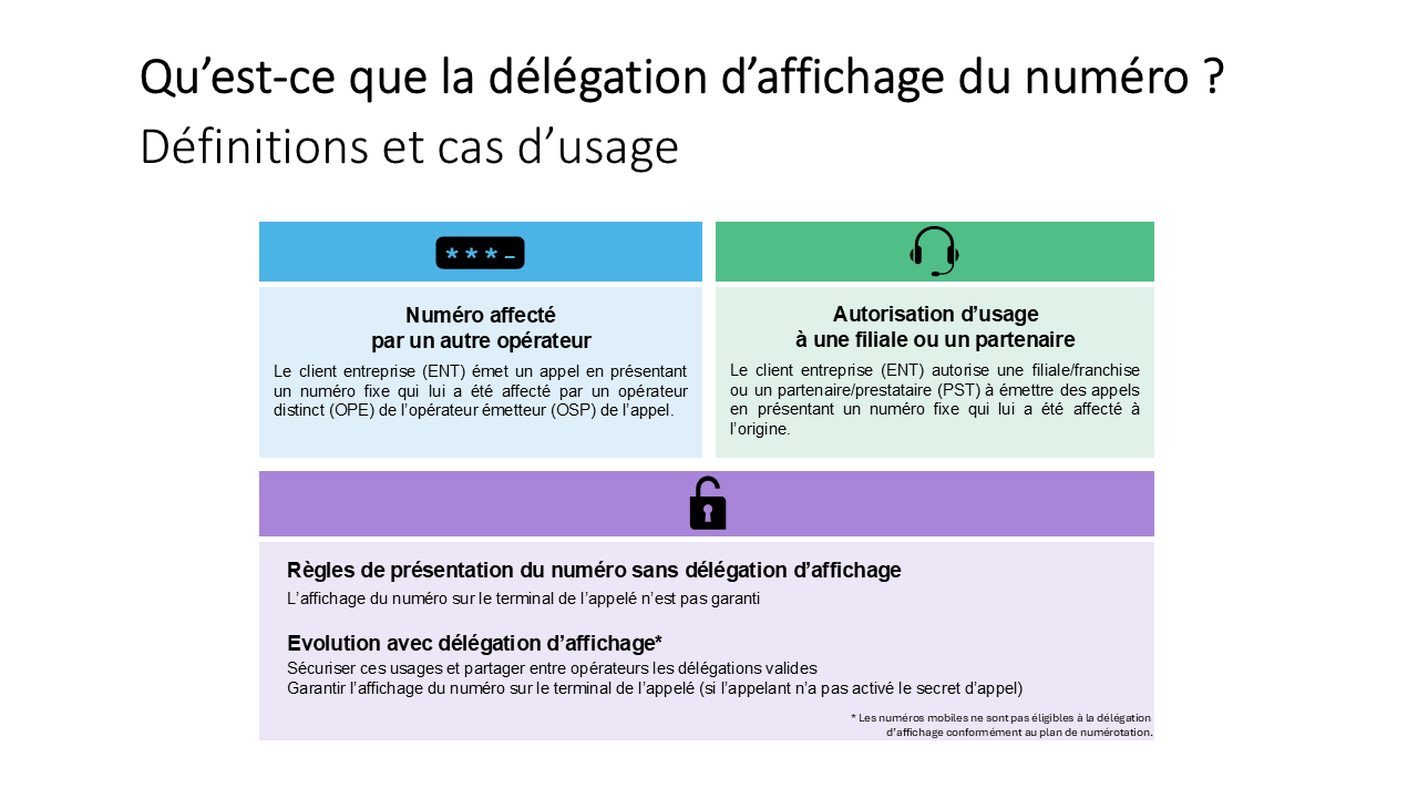 Dans la continuité, la solution de délégation d’affichage permet désormais à un client final, à qui un opérateur exploitant a affecté un numéro fixe, porté ou non, d’autoriser l’affichage dudit numéro – éventuellement par l’intermédiaire d’un tiers – par un opérateur d’origine qui n’est pas l’opérateur exploitant.